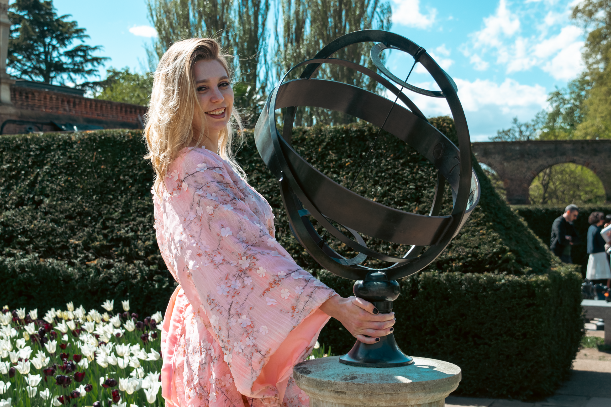 Justyna Sekmistrz posing in front of the lake at Holland Park, wearing a soft pink kimono under midday sunlight.